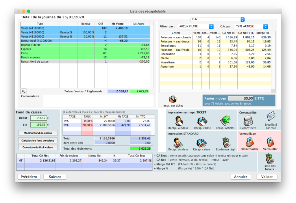 Toutes les informations importantes réunies en un seul écran : vos ventes (remisées ou non) & retours, les paiements, rendus & acomptes, les mouvements de caisses, les montants de TVA, votre Chiffre d’Affaires et votre marge.